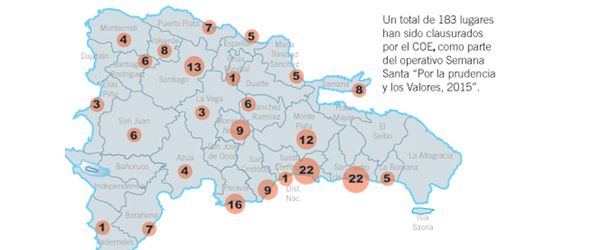 Estarán cerradas al público la playa Güibia de la capital; la presa de Monción en Santiago Rodríguez; el balneario la represa del río Chavón en La Romana; el salto de Jimenoa en Jarabacoa, y las concurridas playas San Rafael y Los Patos en Barahona.