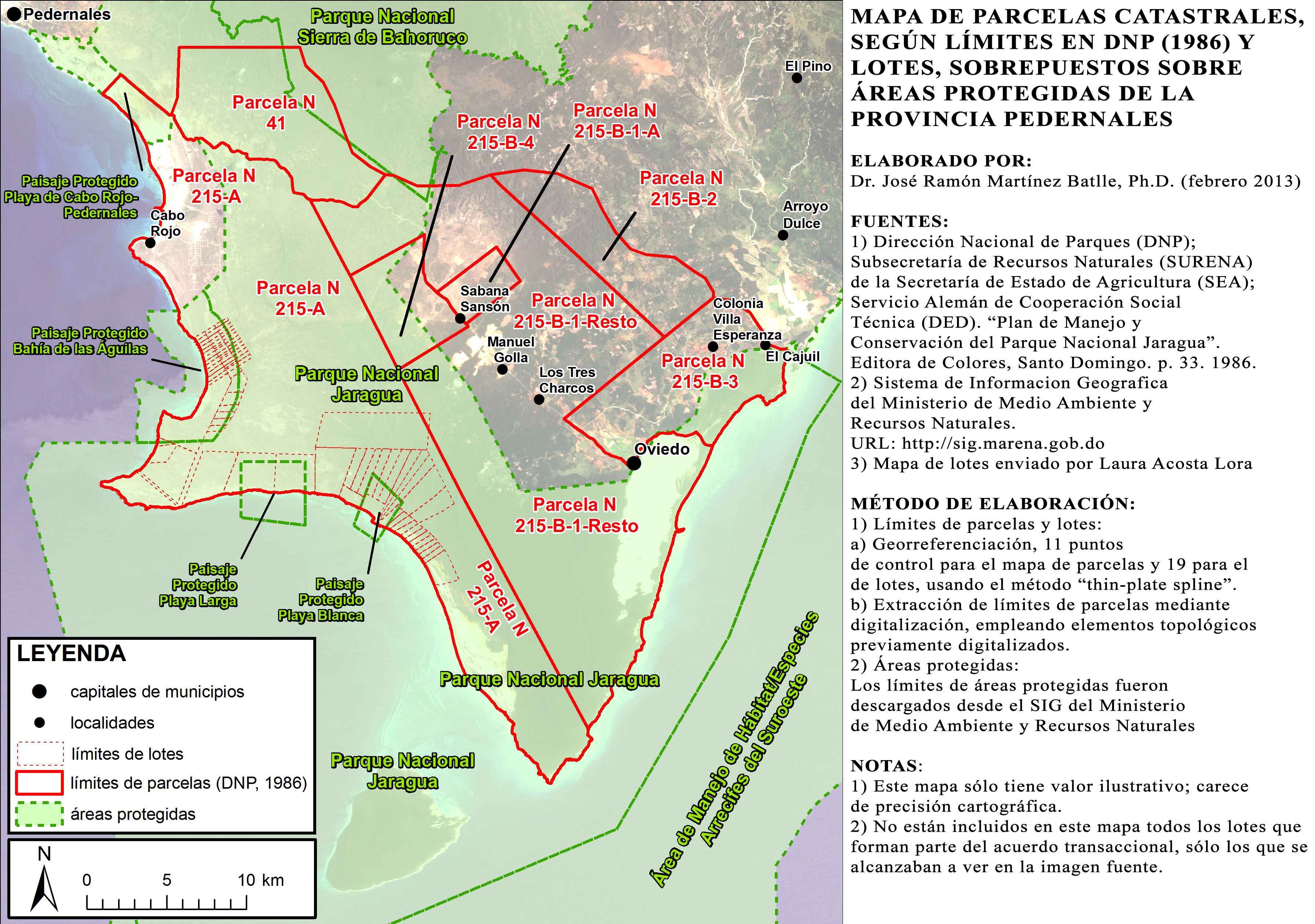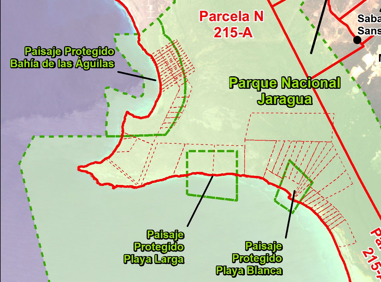 A continuación se muestra el mapa en una visualización de conjunto; más abajo, un detalle para ver mejor la disposición y el número de lotes. Nótese que TODOS, SIN EXCEPCIÓN, ESTÁN DENTRO DE ALGÚN ÁREA PROTEGIDA (recordar que el fondo verde traslúcido es área protegida). Los sectores concretos son: bahía de las Águilas, punta Timanché, cabo Falso, playa Chiquita, playa Larga, playa Blanca, bucán Basse (importantísimo humedal), entre otros. Hay también algunas parcelas algo alejadas del litoral, en áreas igualmente sensibles del Parque Nacional Jaragua.
