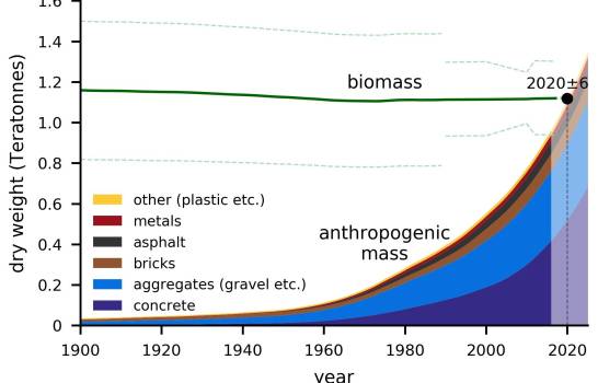 La masa de todo lo fabricado por los seres humanos ha crecido hasta igualar a la masa de toda la vida en el planeta, su biomasa, y tras una momentánea desaceleración debida a la pandemia del coronavirus, esta acumulación seguirá aumentando hasta sobrepasarla, con la posibilidad de duplicarla en el 2040.