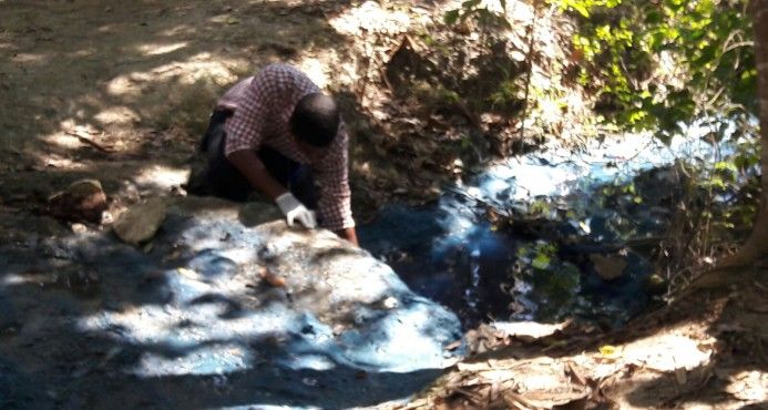 SANTO DOMINGO. Técnicos del Viceministerio de Gestión Ambiental inspeccionaron y tomaron muestras de un agua de color azul que estaba siendo vertida en Laguna Mallén, San Pedro de Macorís.