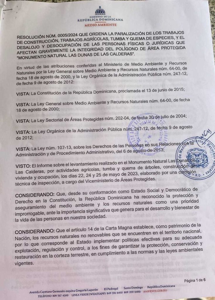 La ordenanza está plasmada en la resolución 0005/2024, firmada por el ministro Miguel Ceara Hatton y emitida el pasado 21 de junio del presente año. El documento detalla que sendas disposiciones fueron establecidas «como medida de seguridad para restaurar la conservación del medio ambiente y la legalidad conculcada, en virtud de lo establecido en el artículo 55 de la Ley General sobre Medio Ambiente».