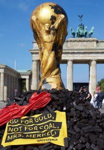 Los activistas trasladaron al lugar una réplica gigante de la Copa del Mundo de fútbol sobre ladrillos de carbón con el lema “Ve a por el oro, no a por el carbón, señora Merkel”.