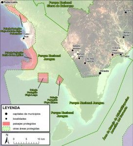 Áreas protegidas de la provincia Pedernales. Las unidades del tipo “paisaje protegido”, localizadas preferentemente en el litoral occidental, se resaltan en rojo traslúcido. Sin descuidar el Parque Nacional Jaragua, debemos estar muy atentos con el destino de estos espacios. Elaborado por: Dr. José Ramón Martínez Batlle, Ph.D. (febrero 2013), a partir de imagen Landsat ETM+ (de fondo) y mapa de áreas protegidas de República Dominicana del Ministerio de Medio Ambiente y Recursos Naturales (sig.ambiente.gob.do)