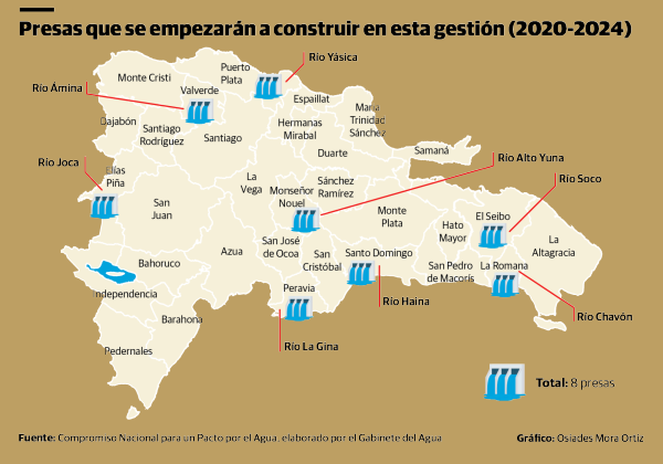 En el documento de compromiso que entregó el presidente Luis Abinader al Consejo Económico y Social (CES) para empezar a discutir lo que terminaría siendo el Pacto por el Agua, el Gobierno expresó la necesidad de construir otras 9 presas.