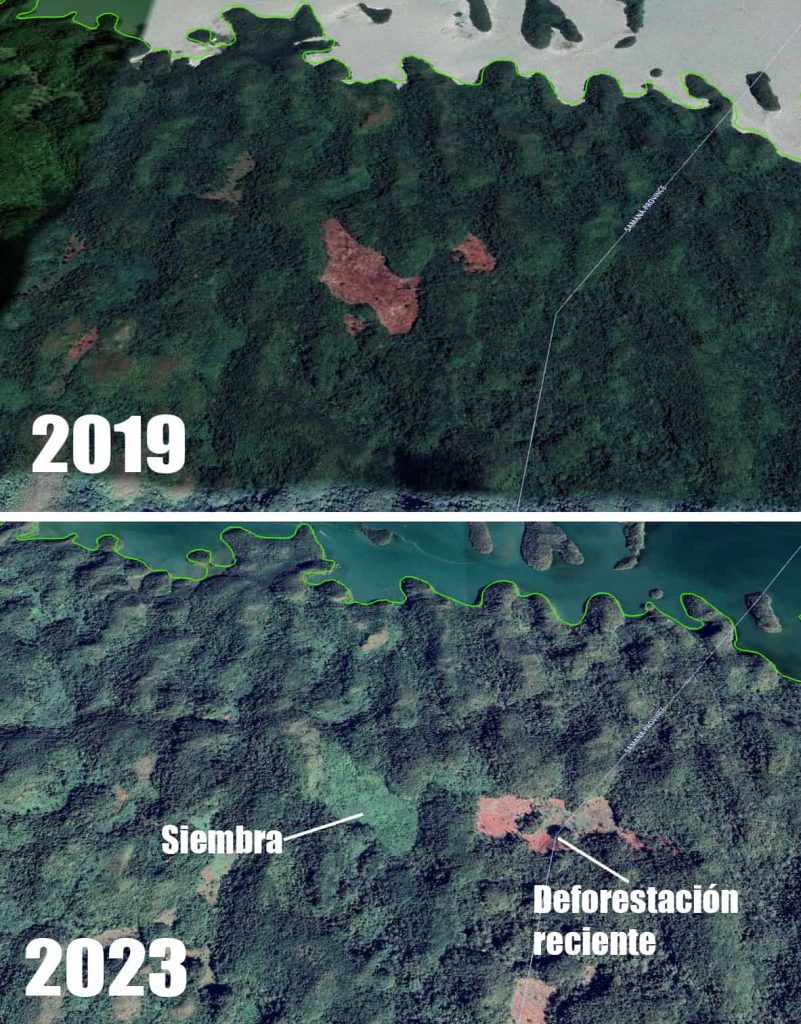 Hace aproximadamente dos semanas, una pareja de turistas hacía una caminata al norte del área protegida. A los pocos minutos de caminar por un sendero se encontraron con decenas de árboles talados, algunos de gran tamaño. Diario Libre obtuvo algunas de las fotografías y las coordenadas del lugar de la tala y, al verificarlas con imágenes de satélite, se puede apreciar claramente la zona recientemente talada, contigua a otra área impactada entre enero y abril de 2019, sembrada actualmente de lo que aparenta ser yautía. Entre ambos polígonos deforestados suman unas 20 hectáreas.