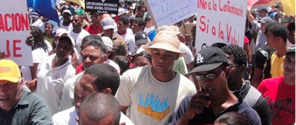 Cientos de personas organizadas en agrupaciones populares y de la sociedad civil montaron durante dos horas una vigilia en la parte frontal de la entrada hacia la mina de oro de Pueblo Viejo, reclamando del Gobierno la modificación del contrato de explotación de los sulfuros, suscrito entre la Barrick Gold y el Estado.