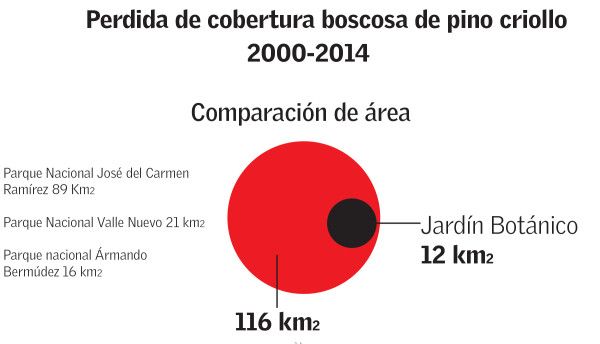 Según cálculos del geógrafo físico José Ramón Martinez Battle, solo en Valle Nuevo se perdieron más de 20 kilómetros de cobertura boscosa entre 2000 y 2014, sin tomar en cuenta las zonas con cobertura con densidad inferior al 50%.