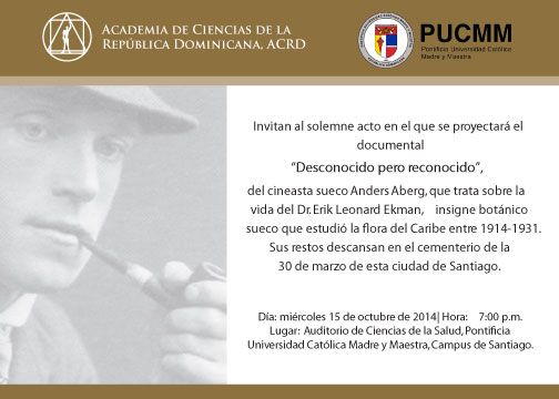 Proyección de documental «Desconocido pero rconocido» sobre la vida de Erik Ekman octubre 13, 2014 :: Agenda Verde Documental: «Desconocido pero reconocido» sobe la vida de Erik Ekman. Miércoles 15 de octubre 2014 7:00 p.m. Auditorio de Ciencias de la saud PUCMM Santiago. 2014-10-13 Compartir tweet