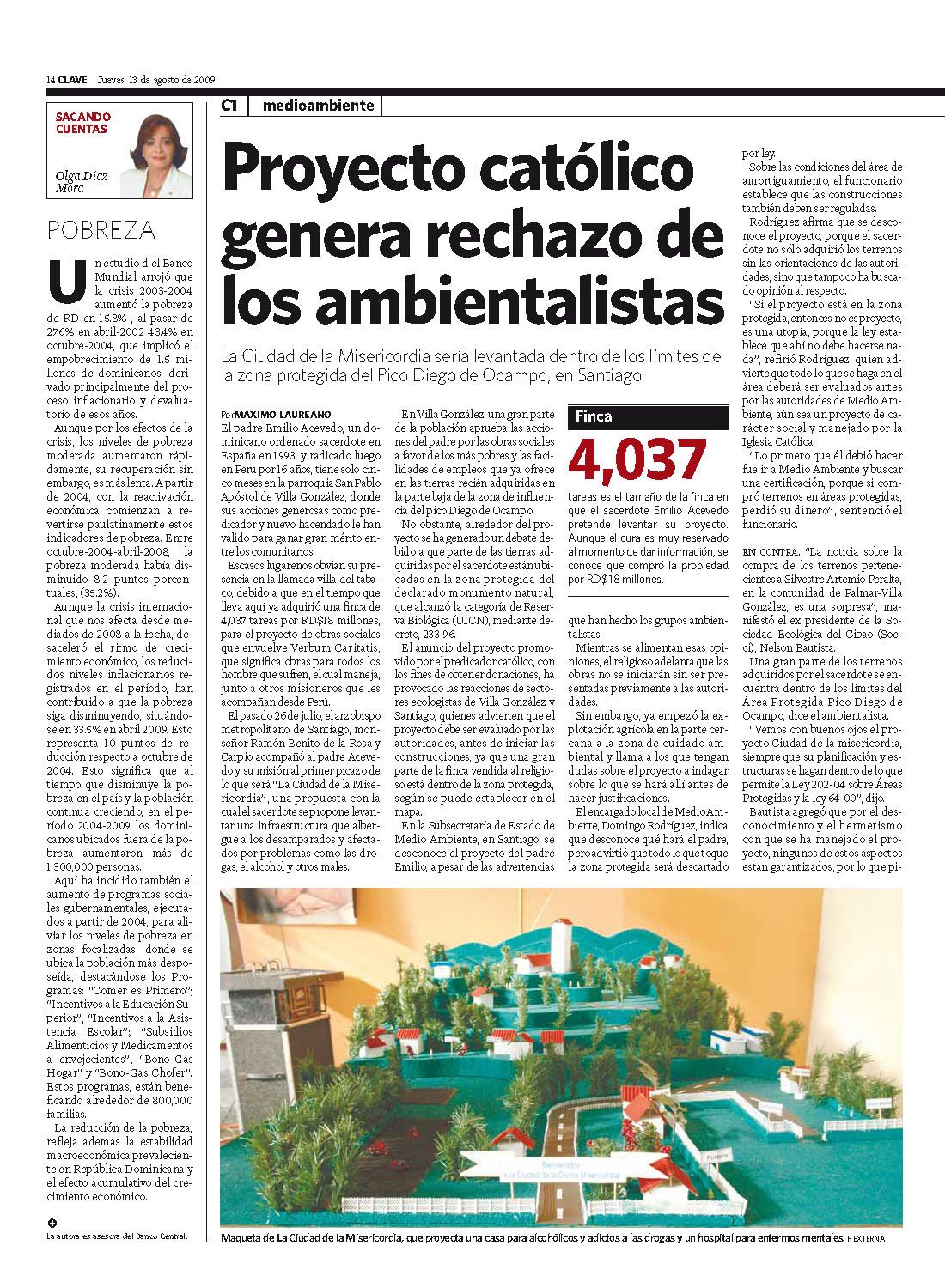 Proyecto católico genera rechazo de los ambientalistas agosto 17, 2009 :: Articulos, :: Asi Andamos La Ciudad de la Misericordia sería levantada dentro de los límites de la zona protegida del Pico Diego de Ocampo, en Santiago 2009-08-17 Redaccion Compartir tweet