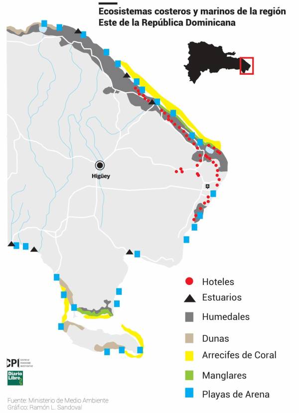En un censo que coordinó el investigador Luis Almánzar -quien participa en el proyecto con Rosado- se contó que hasta diciembre de 2016 había 308 infraestructuras a lo largo de la línea de costa y zona marina adyacente. Para el levantamiento de datos se consideró un complejo hotelero y residencial como una infraestructura.