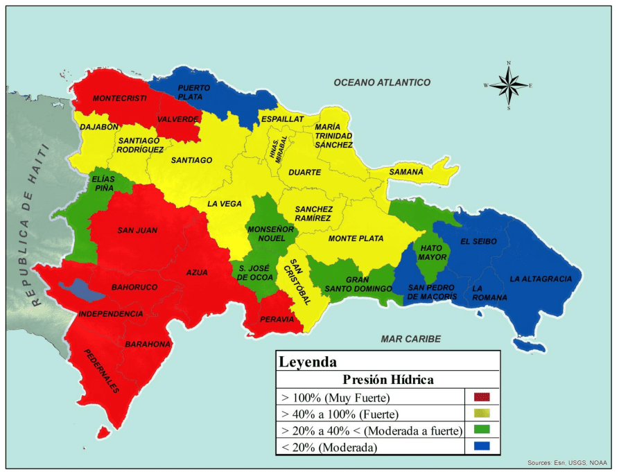 En el país hay ocho provincias con una presión hídrica muy fuerte o de escasez crónica, pero se estima que el número crezca a 16 para el año 2025 si no se toman las medidas correctivas. Actualmente están en esa situación Peravia, Azua, Barahona, Pedernales, Independencia, Bahoruco, San Juan, Valverde y Montecristi.