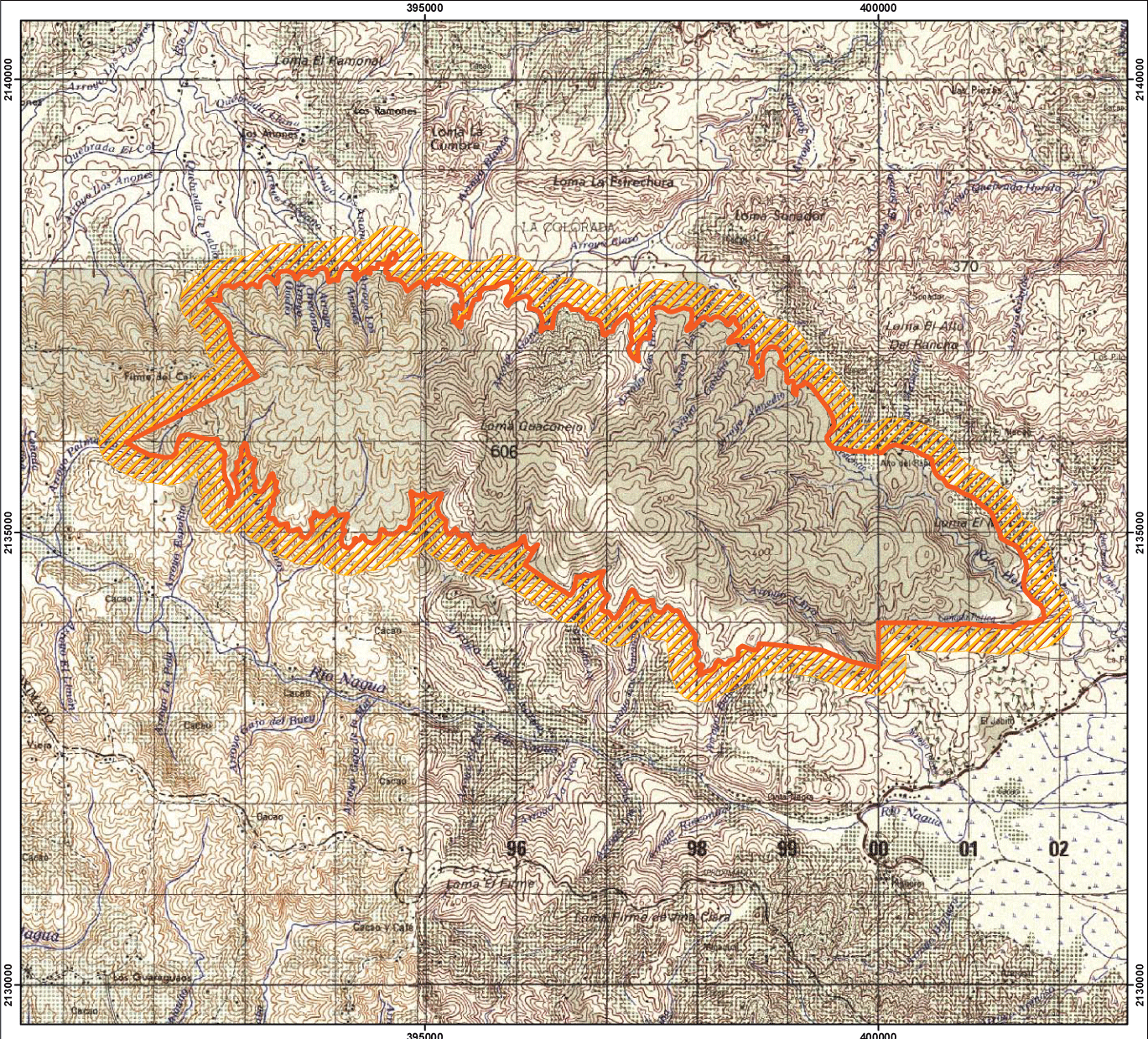 Loma Guaconejo, con los límites y superficie que se describen a continuación: se toma como punto de partida el firme del Alto del Rancho, coordenadas UTM 400200 ME y 2135950 MN, siguiendo en dirección sureste por el camino que va paralelo a la loma El Macao, separando los cacaotales del bosque húmedo hasta la cañada que baja al río Helechal, siguiendo por esta última hasta su confluencia con el río Helechal, el cual sirve de límite hasta su confluencia con la cañada Patica, ascendiendo luego por esta última hasta cota topográfica 160 M snm, de donde se continúa la delimitación en dirección este en línea recta hasta tocar las coordenadas UTM 300000 ME y 2134000 MN, de donde se continúa la delimitación en dirección sur en línea recta hasta tocar el arroyo Claro en las coordenadas UTM 400000 ME y 2133525 MN, de donde se continúa la delimitación en dirección noroeste por la divisoria topográfica al sur del arroyo Claro por la cual se asciende hasta tocar la cota topográfica de los 300 metros, la cual se sigue en dirección oeste cruzando la cabecera de los arroyos Los Naranjos, La Guamita, Vuelta Larga y Los Pomos, hasta llegar al camino que sube al firme El Calvario, el cual se sigue en dirección noroeste, hasta tocar las coordenadas UTM 391700 ME y 2136000 MN; de este punto se pasa en dirección este hasta tocar las coordenadas UTM 393150 ME y 2136725 MN, de donde se sigue el límite por el límite oeste de la cuenca de la Quebrada de Pablo, hasta la cota topográfica 200 M snm (coordenadas UTM 392600 ME y 2137550 MN). De este punto se sigue hacia el este por la misma cota cruzando la cabecera de los arroyos Ovidio, Orégano, Los Anones, Blanco, Claro, Los Ganchos, Los Hernández, Colorado, Gancho Bravo y Al Medio, de donde se sigue por el camino que va paralelo al arroyo Valentín, llegando al Alto del Rancho que fue el punto de partida. El polígono antes descrito encierra una superficie de aproximadamente 23.45 Km².