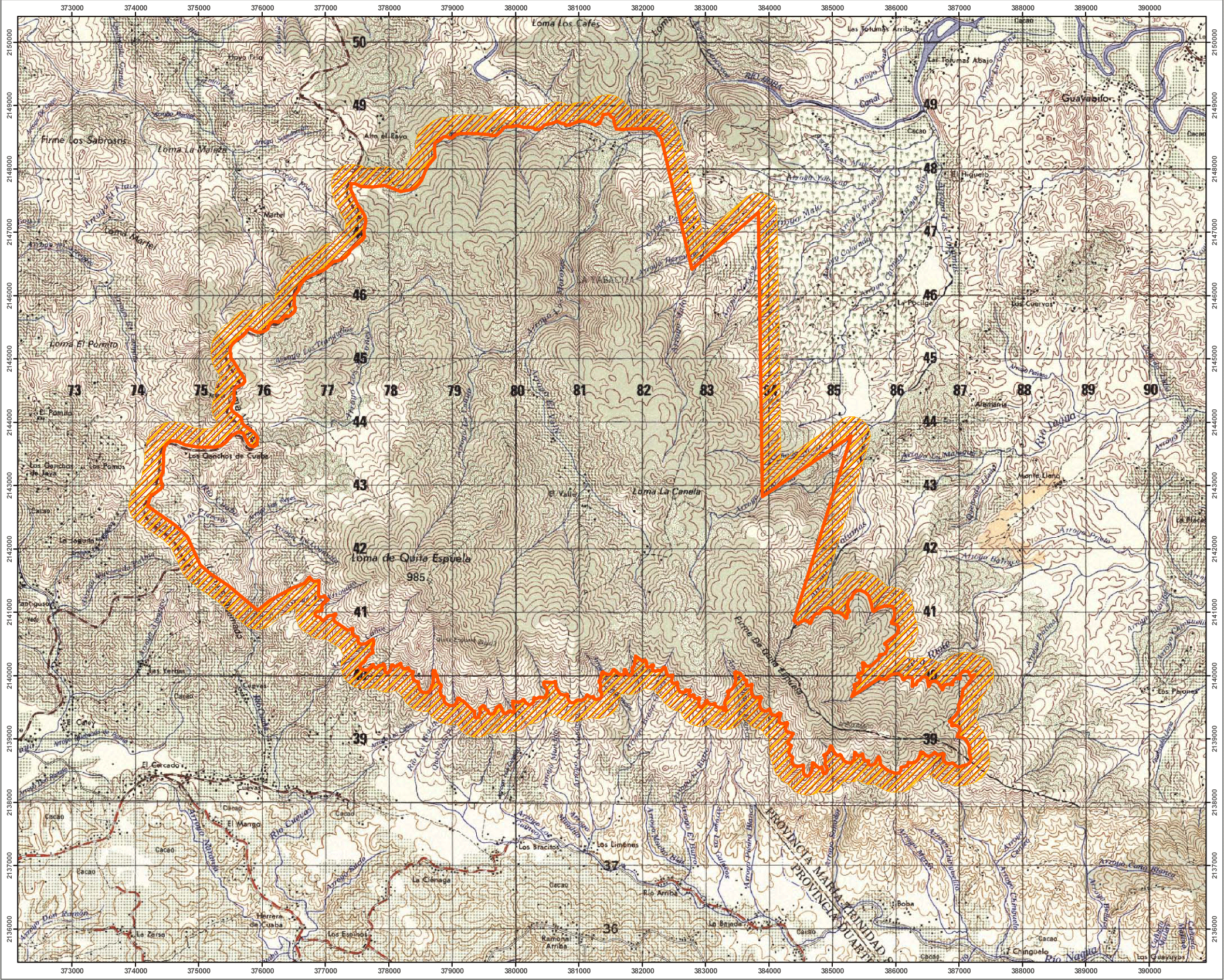 Loma de Quita Espuela, se establece el punto de partida en la confluencia del arroyo El Arroyazo con el río Cuaba, en las coordenadas UTM 0375885 y 2140962 (cuadrante 75-76 y 40-41), de donde continúa en dirección oeste, ascendiendo por el firme El Quemado hasta llegar a la carretera que viene de Naranjo Dulce, en las coordenadas 0374170 y 2142600 (cuadrante 74-75 y 42-43) y continúa por la carretera cruzando los firmes de los Ganchos de Cuaba y Loma Vieja, hasta llegar a un firme ubicado a unos 600 metros antes del poblado Alto de Rayo en las coordenadas UTM 0377350 y 2147700 (cuadrante 77-78 y 47-48), de este firme continúa en dirección nordeste hasta descender a la confluencia del arroyo Las Cañitas con el río Boba en las coordenadas UTM 0380675 y 2148650 (cuadrante 80- 81 y 48-49). Desde este punto sigue por el río Boba hasta el lindero de la finca de coco de la empresa Lavador, en las coordenadas UTM 0381280 y 2148650 (cuadrante 81-82 y 48-49), luego sigue por los linderos de esta finca hasta el arroyo Las Totumas pasando por los siguientes puntos de coordenadas UTM: 0382250 y 2148400,0382750 y 2146350, 0383780 y 2147240, 0383860 y 2142750, 0385250 y 2143700, 0384350 y 2140800. Desde este último punto de coordenadas, donde el arroyo Las Totumas alcanza la cota 500 msnm, se continúa por la cota hasta la intercepción con el río Riote en las coordenadas 0385275 y 2139600, desde aquí continúa descendiendo por el río Riote hasta la cota 400 msnm y sigue por esta cota hasta un camino que asciende del límite de su cuenca en las coordenadas 0387200 y 2139950. Desde este punto se continúa por el camino y asciende hasta la curva de nivel 500 sobre el nivel del mar. Siguiendo esta curva de 500 metros se delimita toda la vertiente sur de Loma Quita Espuela hasta alcanzar el punto inicial, la confluencia del arroyo El Arroyaso con el río Cuaba, cerrar así un polígono que define el área de la reserva con un total de 72.5 km².
