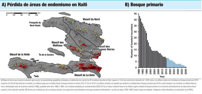 Los investigadores proyectan que todos los bosques primarios en Haití desaparecerán antes del año 2035. La misma suerte correrán entre el 66% y el 83% de sus especies de vertebrados que, por su alto endemismo en el país vecino (51%), tendrán dificultades para refugiarse en República Dominicana, en donde “la pérdida de bosques amenaza la biodiversidad”.