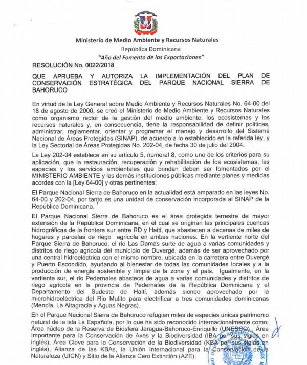 El 24 de abril de 2018 con la resolución NO. 0022/2018, el Ministerio de Medio Ambiente aprobó y autorizó la implementación del Plan de Conservación del Parque Nacional Sierra de Bahoruco, bajo firma de del entonces ministro Francisco Domínguez Brito. Dos días más tarde, el 26 de abril, Domínguez Brito hacía pública su renuncia al cargo, para dedicarse abiertamente a la carrera por la presidencia del país.