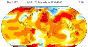 ESTADOS UNIDOS. El mes de mayo de 2017 fue el segundo más caliente de registros modernos, según un análisis mensual de temperaturas globales realizado por científicos del Instituto Goddard para Estudios Espaciales (GISS) de la NASA en Nueva York, que abarcó desde 1880 a 2017. El mes pasado fue 0.88 ...