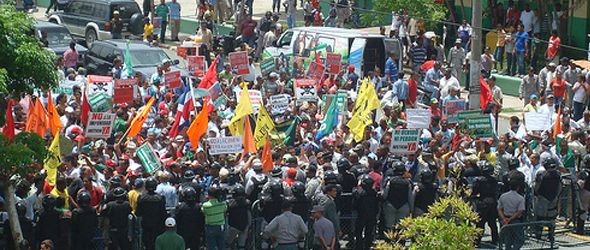 Cientos de personas marcharon ayer hacia el Palacio Nacional en protesta contra la instalación de una fábrica de cemento en la comunidad de Gonzalo, próximo a la zona de amortiguamiento del Parque Nacional Los Haitises. Un cordón policial impidió que los manifestantes llegaran hasta el frente de la Casa de Gobierno.
