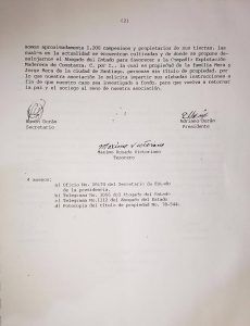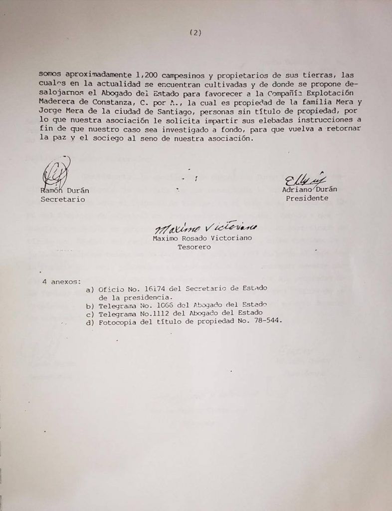 La carta concluye explicando que eran aproximadamente 1,200 campesinos y propietarios de sus tierras, las cuales estaban cultivadas y que se pretendía desalojarlos en beneficio de la Compañía de Explotación Maderera de Constanza, propiedad de la familia Mera y Jorge Mera de la Ciudad de Santiago. Se solicitaba que el caso fuera investigado. Al mismo tiempo remitieron carta al procurador general de la República.