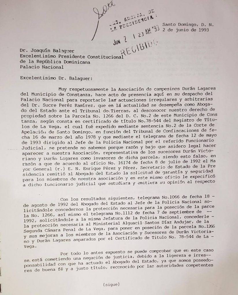 El 2 junio de 1993 la Asociación de Campesinos Durán Lagares del Municipio de Constanza depositó una carta en el despacho de la Presidencia, dirigida al entonces presidente Joaquín Balaguer, para “reportarle” lo que calificaron de actuaciones irregulares y arbitrarias por parte del doctor Sucre Pérez Ramírez, quien se desempeñaba como abogado del Estado ante el Tribunal de Tierras.