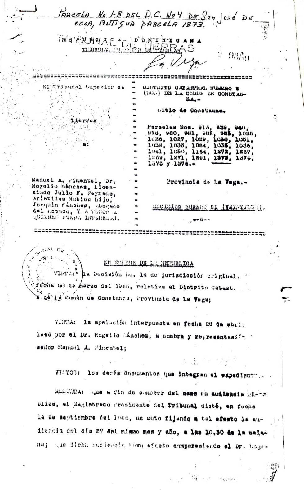 Luego de un largo proceso legal, el Tribunal Superior de Tierras rechazaría la apelación del señor Manuel Pimentel por improcedente e infundada en relación a las parcelas 913, 939 y 940 del Distrito Catastral 2 de la común de Constanza, con fecha 9 de mayo de 1949.