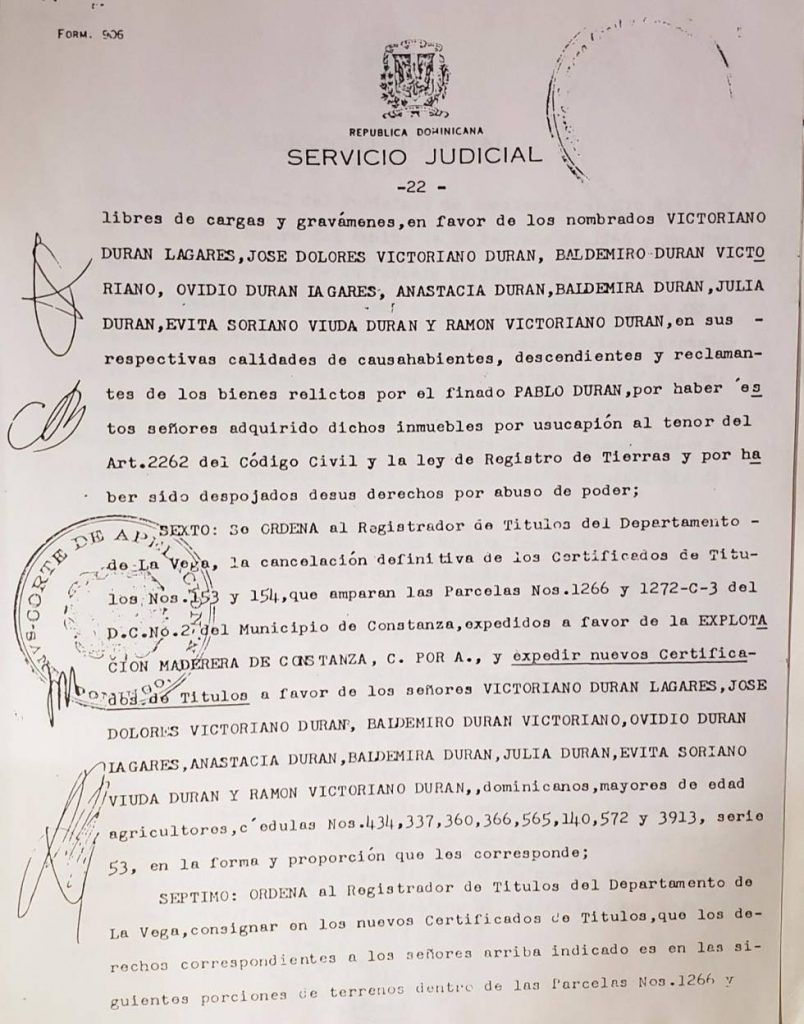 El 28 de agosto el abogado del Estado, doctor Sucre Pérez Ramírez, envió un telegrama al mayor jefe de la Policía solicitándole protección para los señores Durán Victoriano y Durán Lagares, para la posesión de la parcela 1266 del D.C. 2 de Constanza, según el certificado de título No. 78-544 de La Vega.