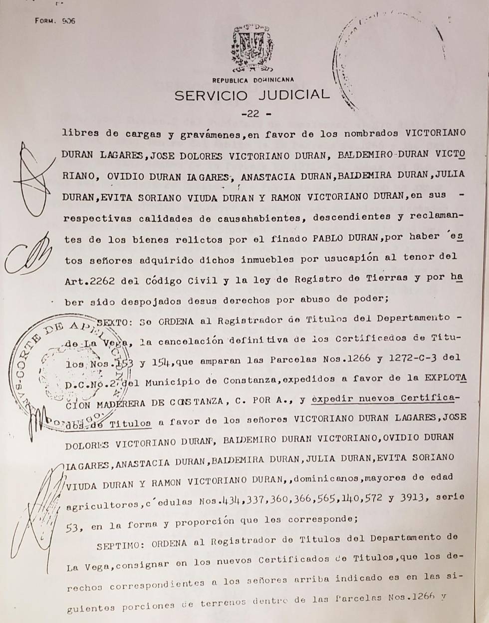 En el documento de 23 páginas se hace un recuento de la forma en que la familia Durán perdió el derecho sobre sus tierras correspondientes a las parcelas 1266 y 1272-C-3 del D.C. No. 2 de Constanza, y se pide ante la corte la anulación de los certificados de títulos de propiedad expedidos en favor de los demandados.