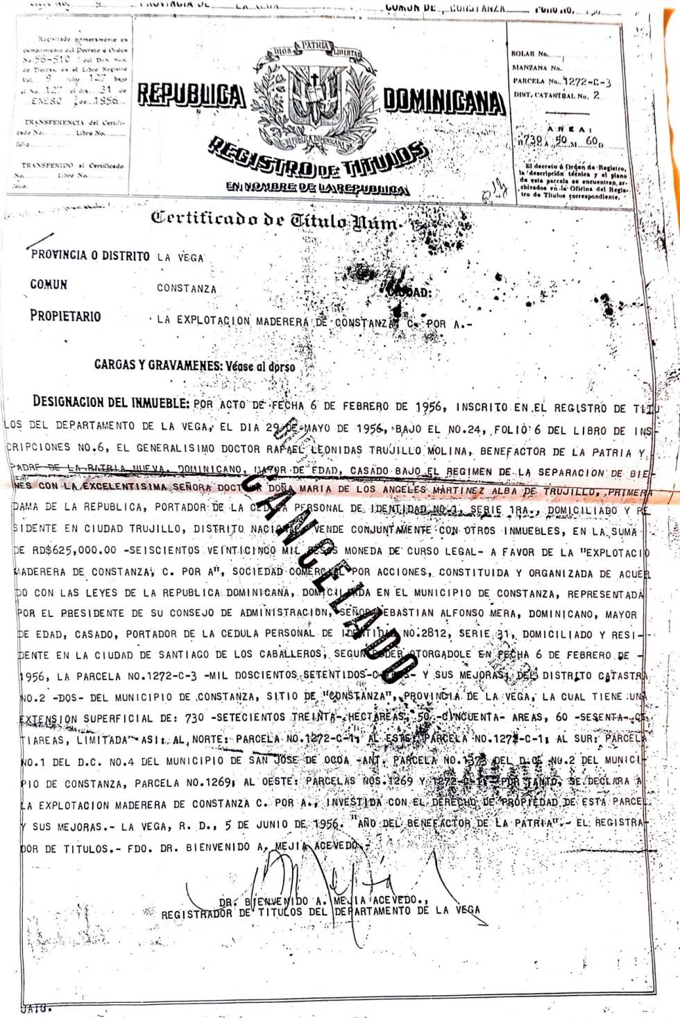 Por medio del Certificado de Título No. 154 de la provincia de la Vega, el 6 de febrero de 1956 Trujillo vende, conjuntamente con otros inmuebles, la parcela No. 1269-C-3 de 750 hectáreas en favor de la Explotación Maderera de Constanza, C. por A, representada por el presidente de su consejo de administración, señor Sebastián Alfonso Mera, por un valor de RD$625,000.
