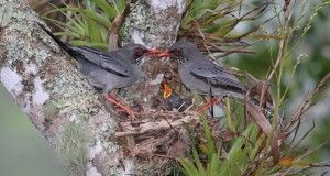 Pone de 2 a 4 huevos azul verdoso con manchas marrones. En la excelente foto de Dax Román observamos dos adultos en el nido con 3 polluelos. Esta familia (Turdidae) está mejor representada en las regiones templadas.